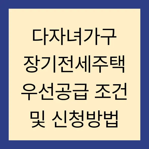주요 키워드: 장기전세주택, 다자녀가구, 우선공급, 조건, 신청방법, 자격요건, 소득기준, 자산기준. 서브 키워드: 전세, 임대주택, 주거안정, 무주택, 자녀양육, 내집마련.
